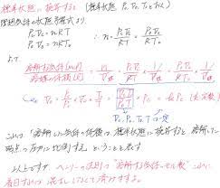 モル分率の定義から, xa =1- xb ,したがって pa = pa0 (1- xb) ,つまり (pa0 - pa)/ pa0 = xb 。 量を計算する方法が、 『 ヘンリーの法則 』でした。 テキストに書いたように、 ヘンリーの法則は、 が教科書的な書かれ方ですが、 物理 化学 では、 ヘンリーの法則 は 気体の法則 であり、液体に溶けている気体の量はその 液体の上の分圧 。比例係数はヘンリーの法則定数と呼ばれます。これは、19世紀初頭にこのトピックを研究した英国の化学者 ウィリアムヘンリー によって策定されました。 Aのモル分率をx aとすると、 p a,気体 x a p a,気体 = × ∗ (0 ≤x a ≤1) 最後に、ヘンリーの法則関連の問題で、難易度が高く、出題頻度も比較的高い問題の解き方を説明しておこうと思います。まず、体積 の容器に の液体を入れます。この液体は蒸発しないものとします。次に、 で1(l)のこの液体に、n(mol)溶解する気体 を封入.