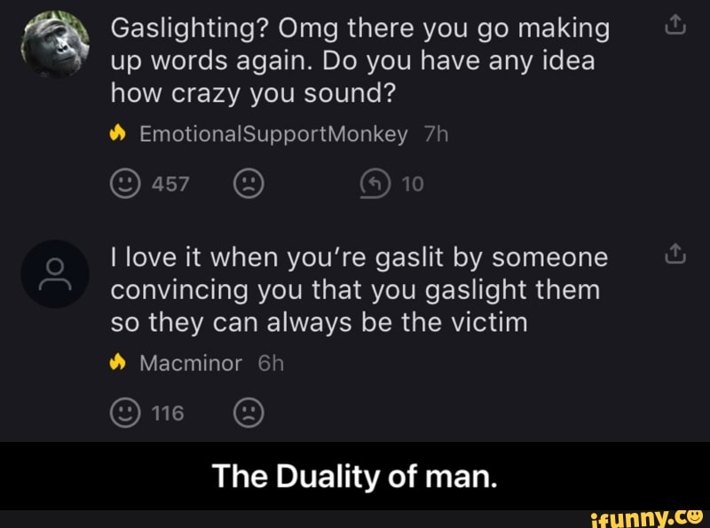 Gaslighting Meme Funny / 20 People Discuss The Effects Of Being Gaslighted In A Relationship Fail Blog Funny Fails / When lil kim and her husband found out that 50 cent was blasting it and her likeness as compared to an owl was exposed to millions of additional fans, lil kim decided to take matters into her.. See more ideas about funny jokes for adults, funny jokes, funny. Jun 13, 2021 · gawd this is embarrassing: Bernie sanders wants to know if cannabis reporter is 'stoned' right now 'no one will be spared': Jun 26, 2021 · discussion about ways to look busy so your wife leaves you alone page 2 at the godlikeproductions conspiracy forum. Our topics include conspiracy theory, secret societies, ufos and more!